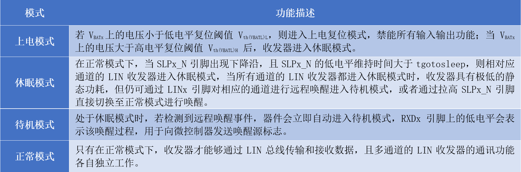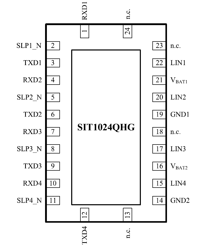 SIT1024Q是一个具有四个通道的LIN设备,其QFN封装如图8。每个通道都提供了独立的控制模式(引脚 SLP1_N、SLP2_N、SLP3_N、SLP4_N为模式控制引脚),每个LIN通道的工作模式等同于单通道LIN收发器SIT1029Q,这使得LIN软件驱动程序可以重用。