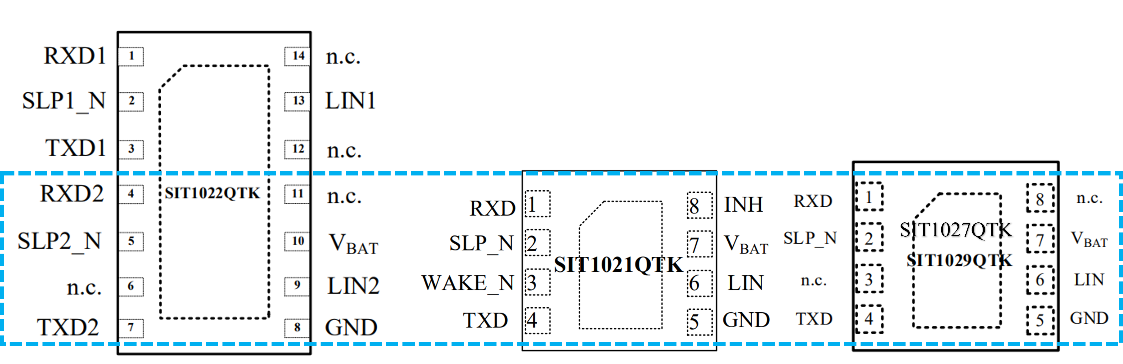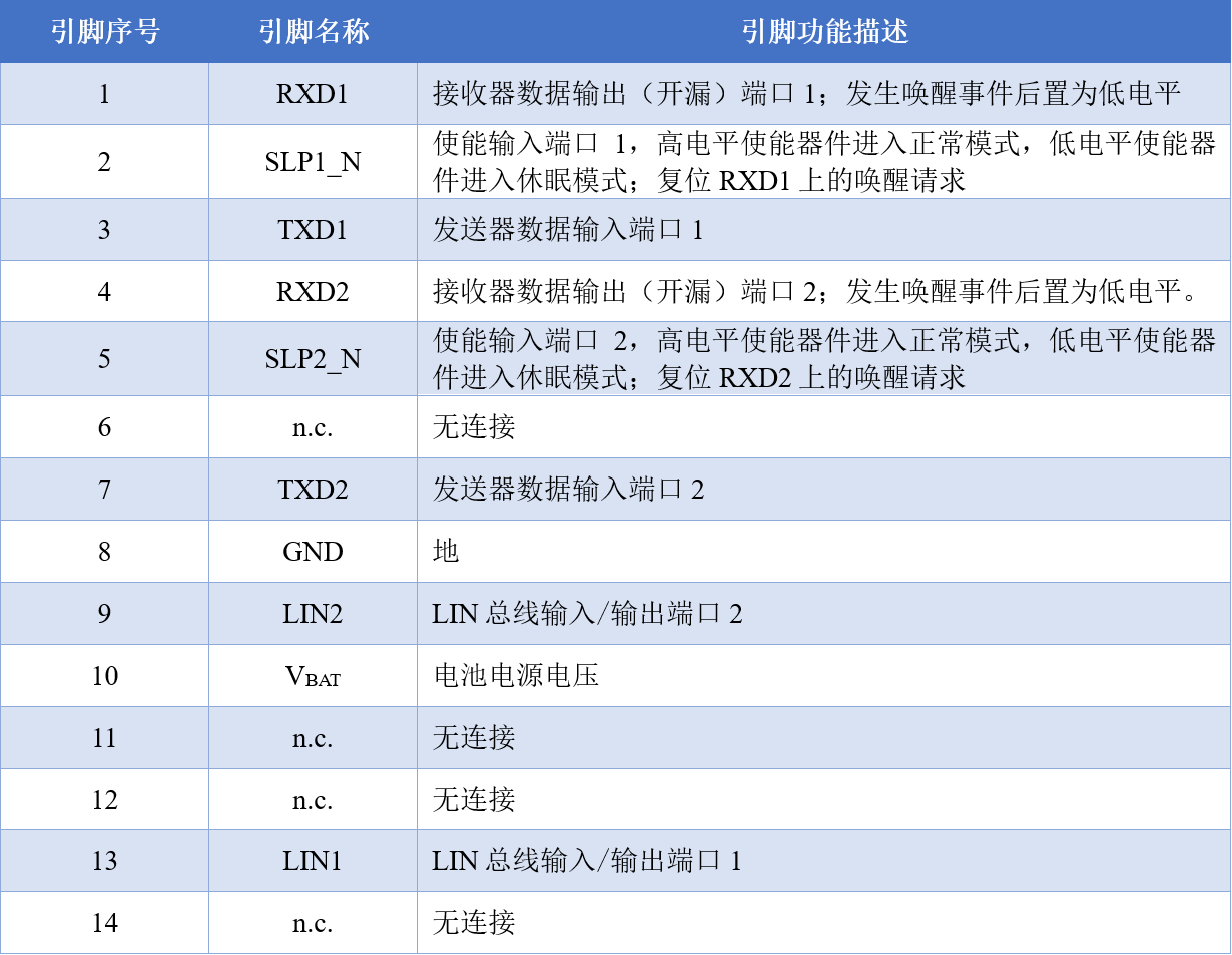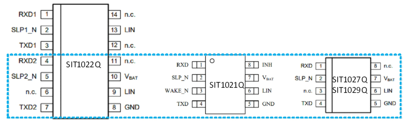 SIT1022Q包含两个LIN收发器通道,每个通道提供独立的模式控制(引脚SLP1_N、SLP2_N为模式控制引脚),为了支持LIN电路板设计的可扩展性,SIT1022Q固定的下半部分兼容单通道LIN收发器,如SIT1021Q,SIT1027Q和SIT1029Q,这使得LIN软件驱动程序可以重用,其SOP封装和DFN封装如图6,引脚功能如图7。