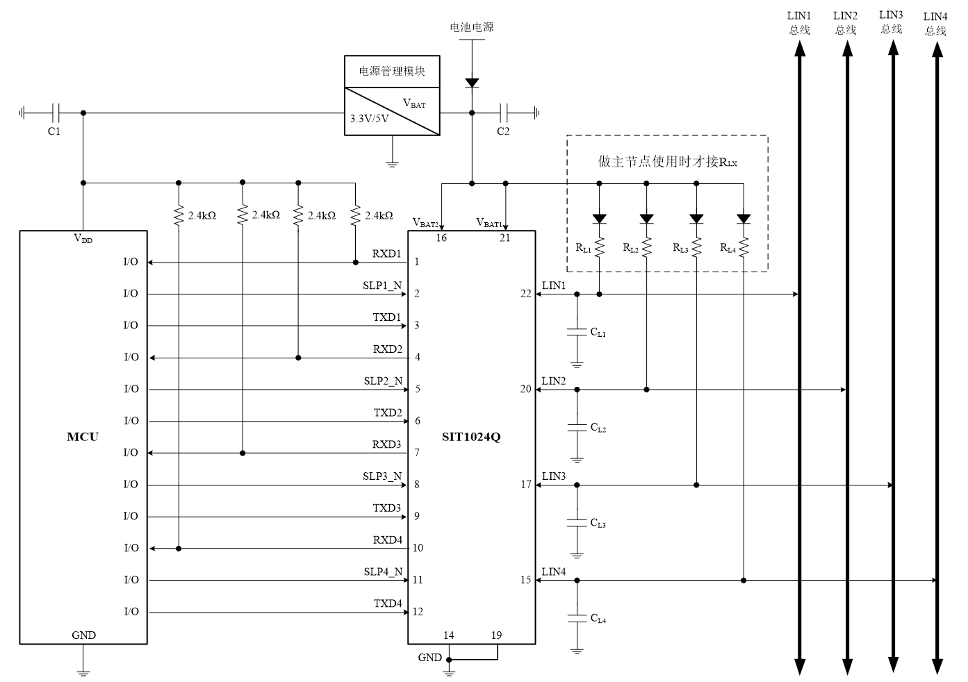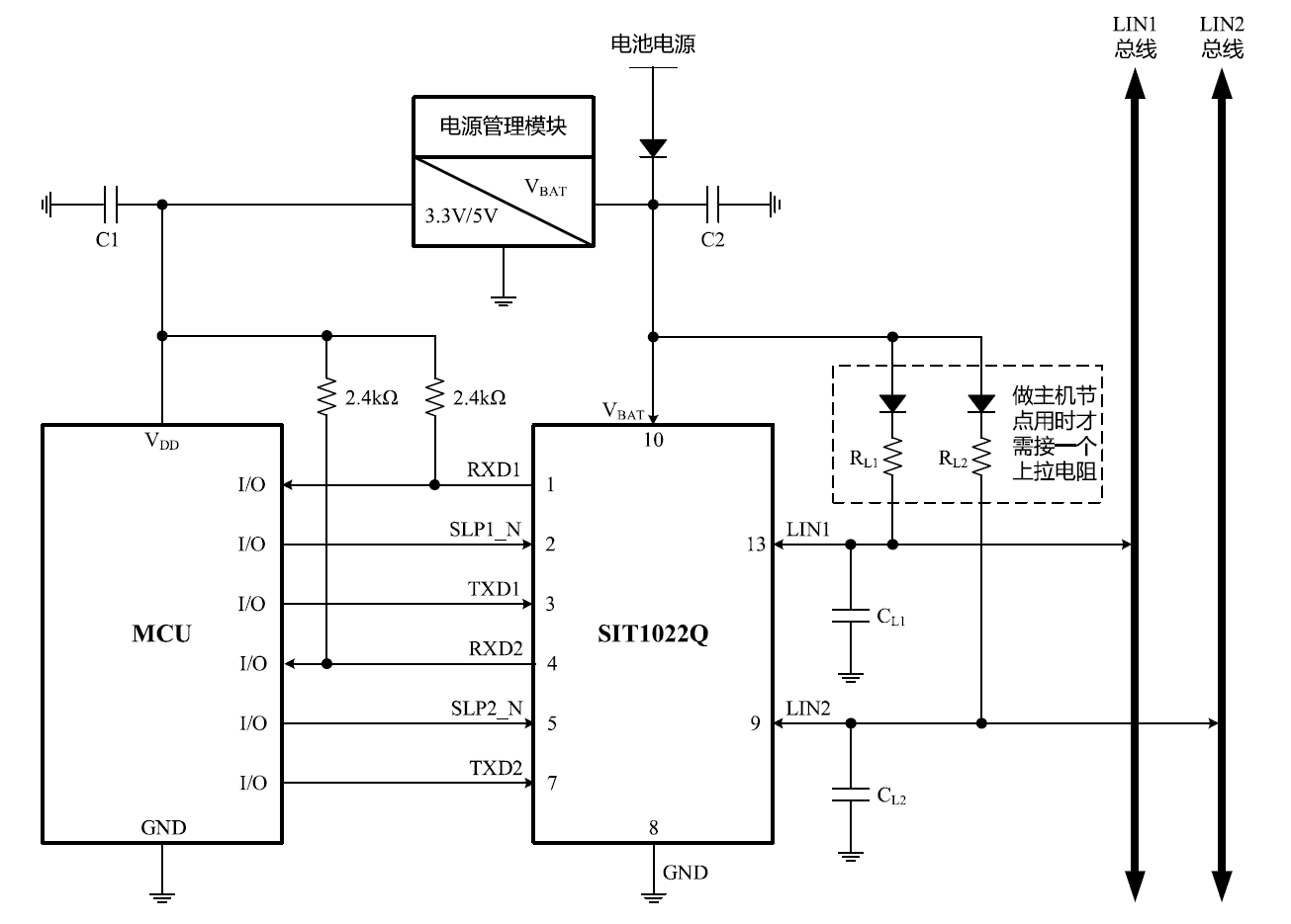 SIT1022Q和SIT1024Q的典型应用示意图分别如图13、14所示,其作为主机节点使用时候,需要接一个二极管和上拉电阻RL。