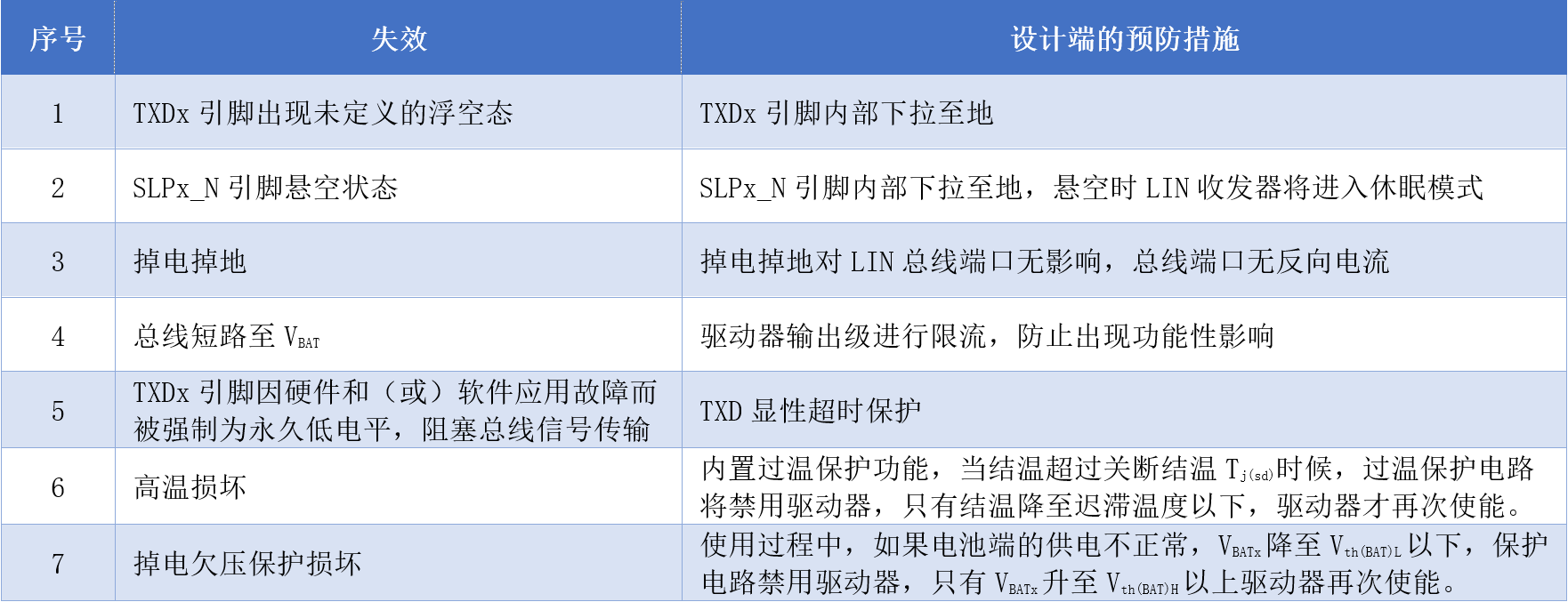 为防止SIT1022Q/SIT1024Q使用过程中出现的功能或者损坏的失效风险,产品从设计端考虑进行预防,其预防失效的安全特性一致,如表2所示。