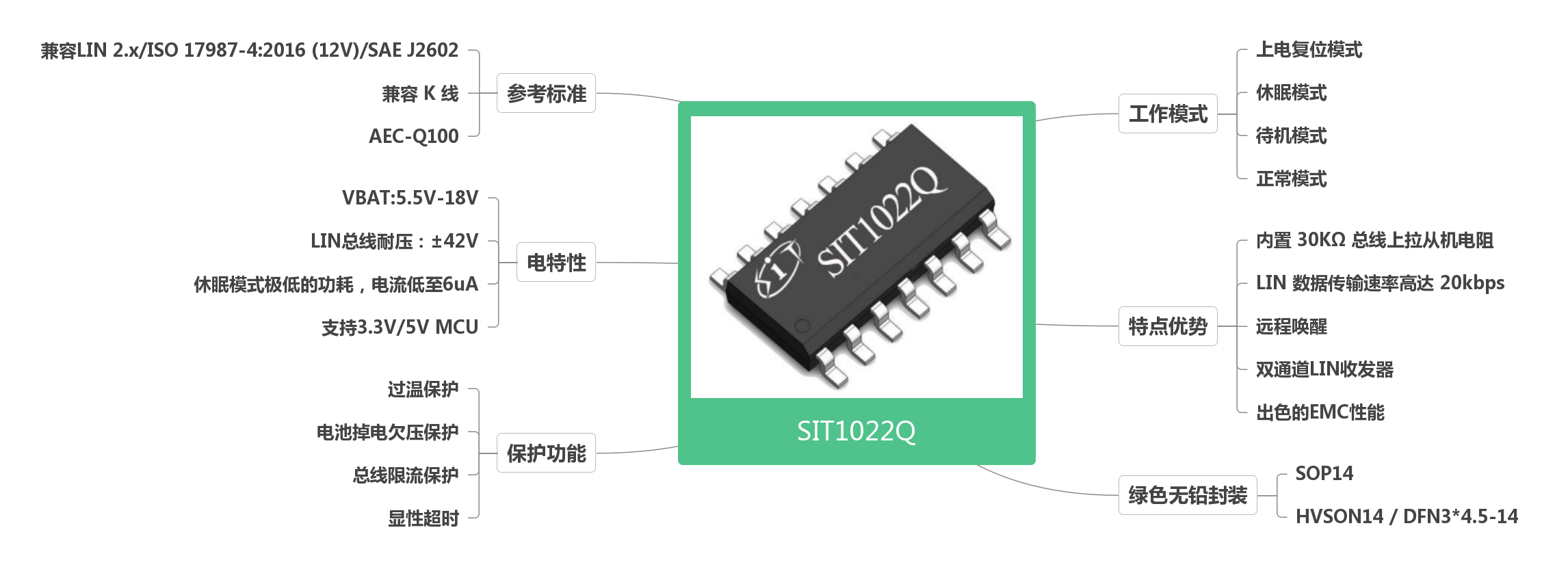 SIT1022Q/SIT1024Q是一款应用于LIN协议控制器和物理总线之间的接口芯片,可应用于乘用车和工业控制等领域,传输速率高达20Kbps。SIT1022Q/SIT1024Q在发送数据输入端(TXDx)接收协议控制器发送的数据流,并将其转换为具有最佳压摆率和波形整形的总线信号;LIN总线上的输入数据由SIT1022Q/SIT1024Q的接收器接收后,通过RXDx端口转换成低压的逻辑电平信号输出至外部的微控制器。此器件兼容“LIN 2.x/ISO 17987-4:2016 (12V)/SAE J2602”标准。