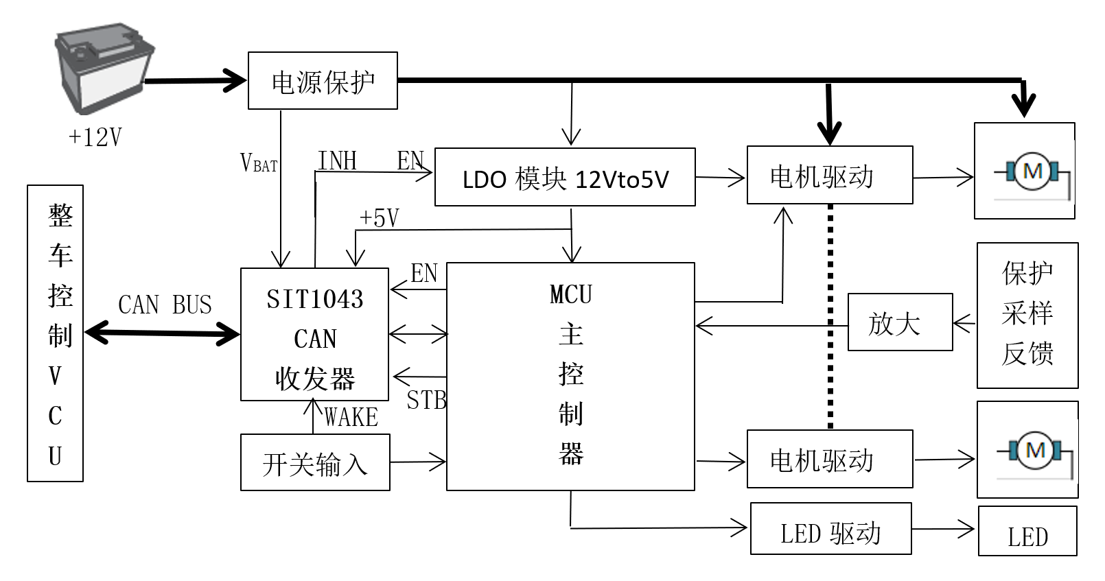 ECU最常见的有:EMS(Engine Mangement System)发动机管理系统,TCU(Transmision Control Unit)自动变速箱控制单元,BCM(Body Control Module)车身控制模块,ESP(Electronic Stability Program)车身电子稳定控制系统,BMS(Battery Management System)电池管理系统,VCU(Vehicle Control Unit)整车控制器等。随着ECU控制范围已经扩张到巡航控制、灯光控制 、安全气囊控制 ,悬架控制 、燃油加热控制、排气控制、制动控制、EGR和增压压力控制等等。下面我们来介绍SIT1043Q在车门控制模块中的应用。在汽车车门模块设计中,其技术需求: