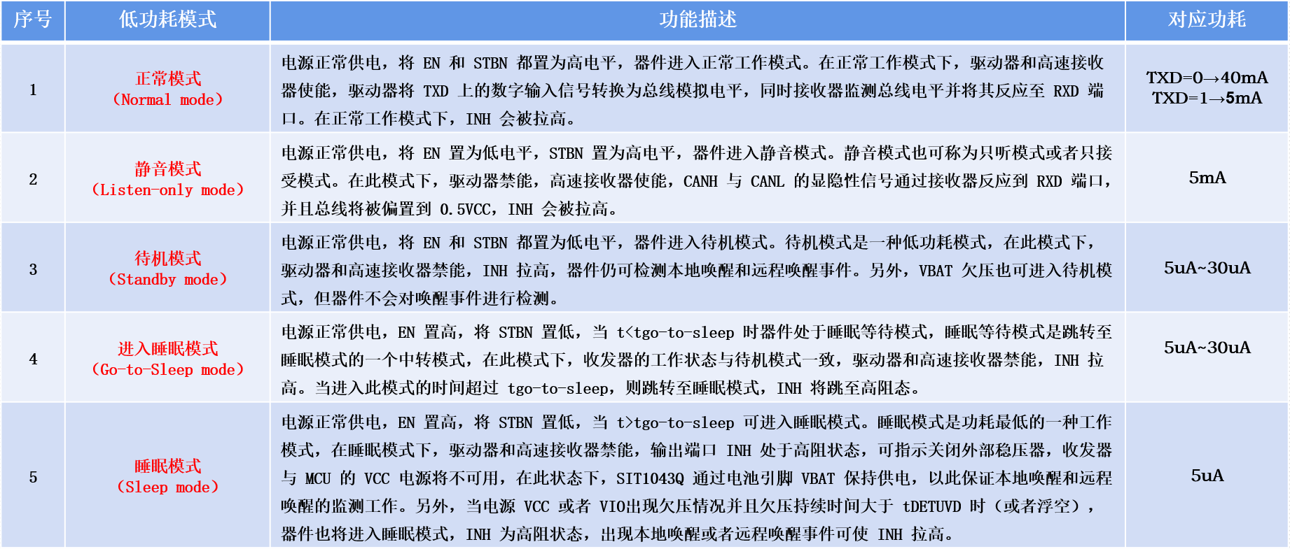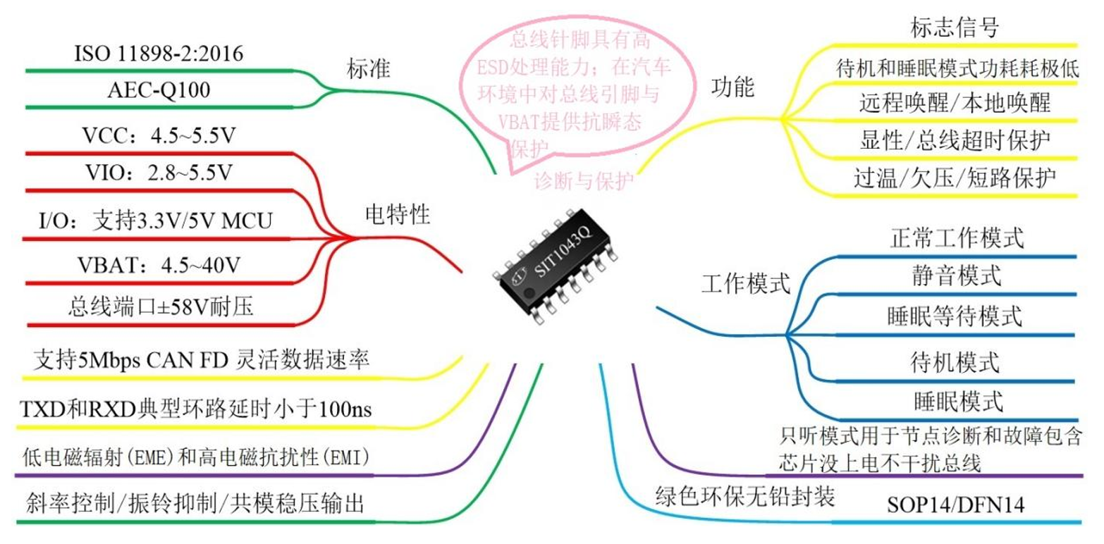 远程唤醒:唤醒源来源于自身ECU节点所在的网络报文,该节点可以处于完全睡眠状态,一般无能量消耗。这种唤醒的特点:只有当CAN收发器监控到总线电平变化或者特定报文时,就会接通CAN芯片INH引脚控制LDO给到主控芯片上电,从而唤醒ECU节点。芯力特公司的SIT1043Q CAN收发器兼容以上两种唤醒功能,下面我们来对SIT1043Q做个简单的介绍。