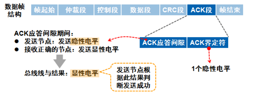 ACK段长度为2个位,包含应答间隙(ACK SLOT)和应答界定符(ACK DELIMITER)。在应答场里,发送站发送两个“隐性”位。当接收器正确地接收到有效的报文,接收器就会在应答间隙(ACK SLOT)期间(发送ACK信号)向发送器发送一“显性”的位以示应答。发送节点检测到总线呈显性状态时,就认为有节点进行了有效地应答并且自己所发出的帧是正常的。