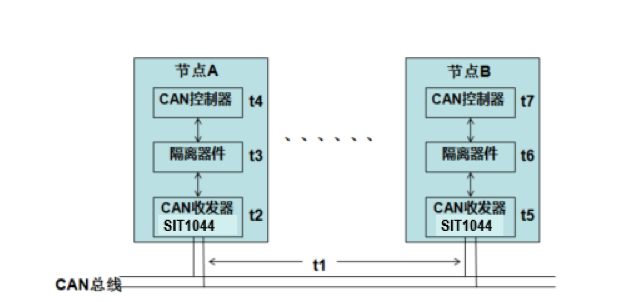 以节点A发送,节点B接收为例,从CAN报文发出开始,到接收到ACK应答,整个应答回路延时为T总=(t1+t2+t3+t4+t5+t6+t7)*2,期间报文经过了4次隔离及收发器,两次线缆;