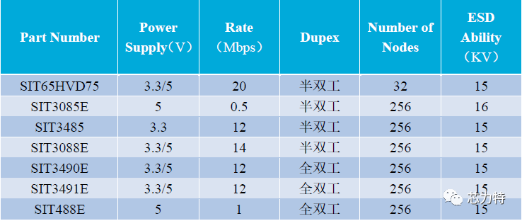 芯力特成为拥有全双工、半双工、5V供电、3.3V供电,满足高速、中速、低速通讯应用的全品类、高品质RS485厂商。各品类典型型号如下。